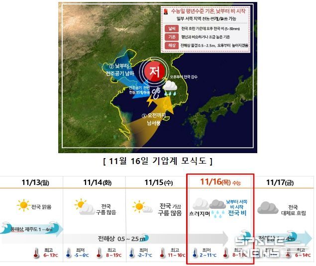 수능 당일인 16일은 저기압 전면에서 따뜻한 남서풍이 유입되며 전국이 대체로 흐린 가운데, 낮부터는 북서쪽에서 차갑고 건조한 공기가 남하하며 그 전면에서 강수가 시작되어 낮에 서쪽에서 비 시작, 오후에 전국으로 확대되겠다고 발표했다.