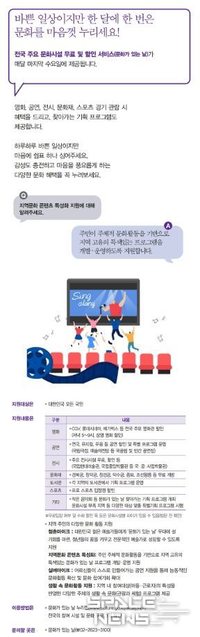 스페이스뉴스 스페이스뉴스 기자 | 전국 주요 문화시설 무료 및 할인 서비스(문화가 있는 날)가 매달 마지막 수요일에 제공됩니다.