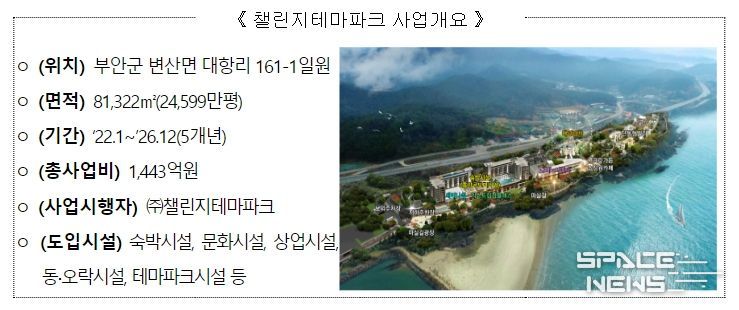 ‘새만금 챌린지테마파크 개발사업‘은 총사업비 1,443억 원을 투자하여 문화시설을 건설하는 사업으로, 올해 안에 착공, 2026년 말 준공하여 2027년부터 본격 운영될 예정이다.