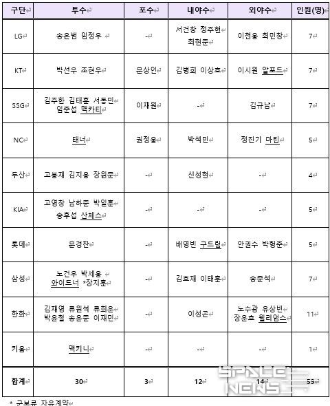 구단 별로는 KT, NC가 58명으로 가장 많았고, 그 뒤를 이어 삼성, 키움 56명, SSG, 롯데 55명, 두산, KIA, 한화 54명, LG 42명이다.