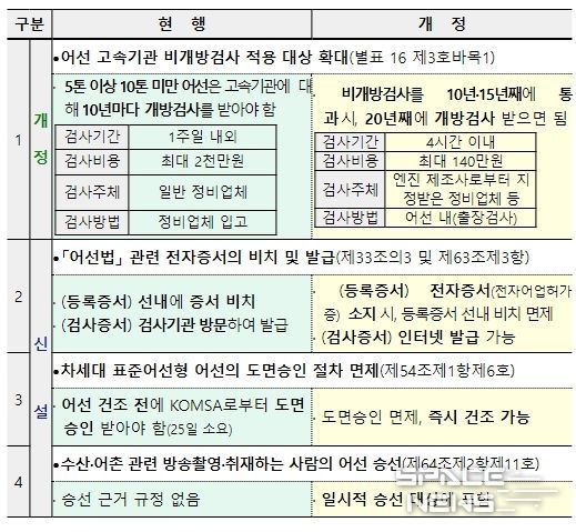 이에, 해양수산부는 해당 영세 어업인의 어려움을 해소하고 소형어선의 안전성도 확보하기 위해 「어선법 시행규칙」을 개정하여 규제를 개선한다.