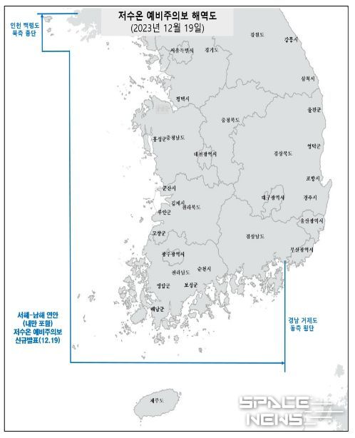 스페이스뉴스 스페이스뉴스 기자 | 해양수산부는 12월 19일 14시부로 서·남해 연안(내만 포함)에 저수온 예비주의보가 발표됨에 따라, 저수온 위기경보 「주의」단계를 발령했다.
