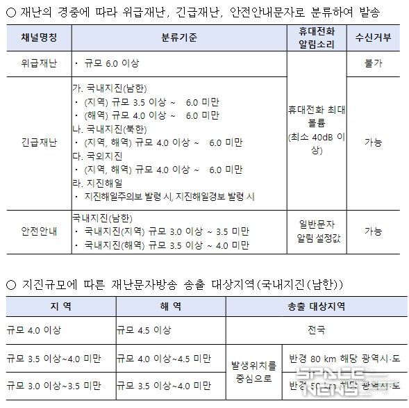 현재는 지역에서 지진 규모 3.0 이상이 발생하면 관련 규정에 근거하여 재난의 경중에 따라 위급재난, 긴급재난, 안전안내문자로 구분하고, 지진의 발생 위치를 중심으로 해당 광역시·도 단위로 지진 재난문자를 송출하게 되어 있다.