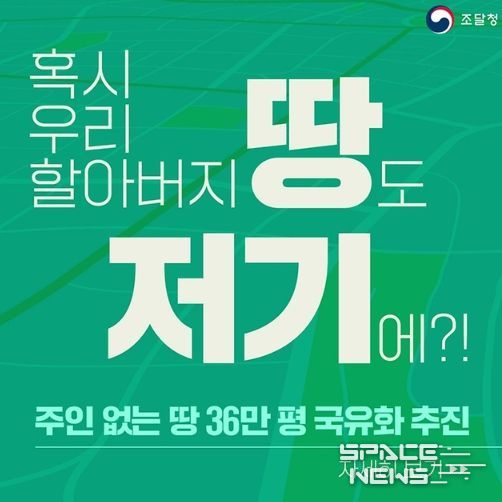 스페이스뉴스 스페이스뉴스 기자 | 조달청은 주인 없는 땅 952필지(36만 3,000평)의 국유화를 추진합니다.