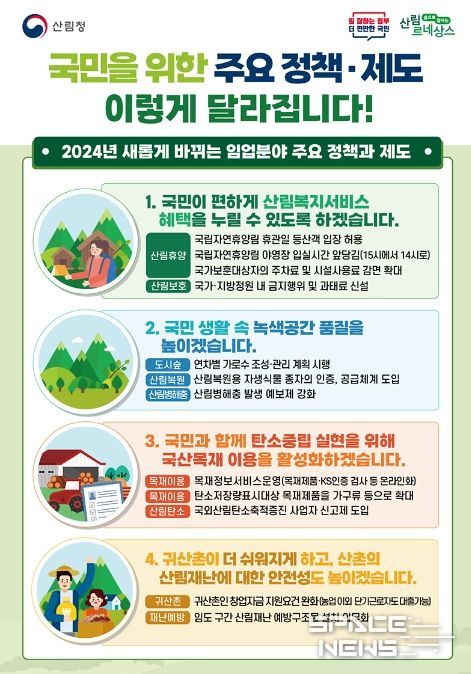 스페이스뉴스 스페이스뉴스 기자 | 2024년 산림청은 국민에게 더 도움이 되고 더 많은 혜택을 드릴 수 있도록 주요정책과 제도를 이렇게 바꾸겠습니다!