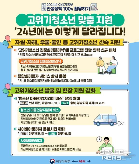 스페이스뉴스 스페이스뉴스 기자 | 집중심리클리닉 등을 통한 신속한 지원과 고위기청소년 발굴 및 현장 지원 강화로 청소년의 마음건강을 위한 맞춤 지원을 강화합니다!