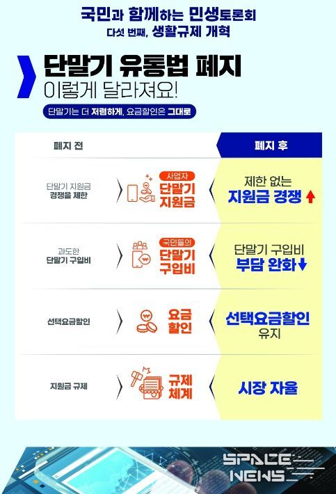 정부는 통신사, 유통점간 자유로운 지원금 경쟁을 촉진하고, 국민들이 저렴하게 휴대전화 단말을 구입할 수 있는 기회를 제공하기 위해 현행 '이동통신단말장치 유통구조 개선에 관한 법률(이하 ‘단말기 유통법’)'을 전면 폐지하기로 했다.