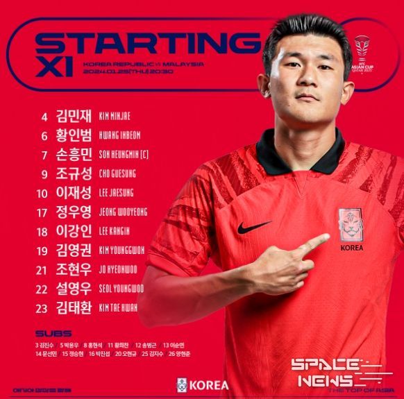 위르겐 클린스만 감독이 이끄는 남자 축구 국가대표팀은 25일 오후 8시 30분(한국시간) 카타르 알와크라의 알 자누브 스타디움에서 말레이시아와 2023 AFC 아시안컵 조별리그 E조 최종전을 벌인다. 승점 4점(1승 1무)으로 요르단에 이어 조 2위를 기록 중인 한국은 이미 16강 진출을 확정한 상태이며 오늘 경기를 통해 조 순위와 토너먼트 대진이 가려진다.