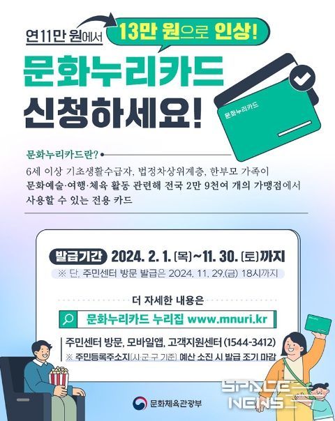 스페이스뉴스 스페이스뉴스 기자 | “2024년 문화누리카드 지원금이 연간 11만 원에서 13만 원으로 인상됩니다.”