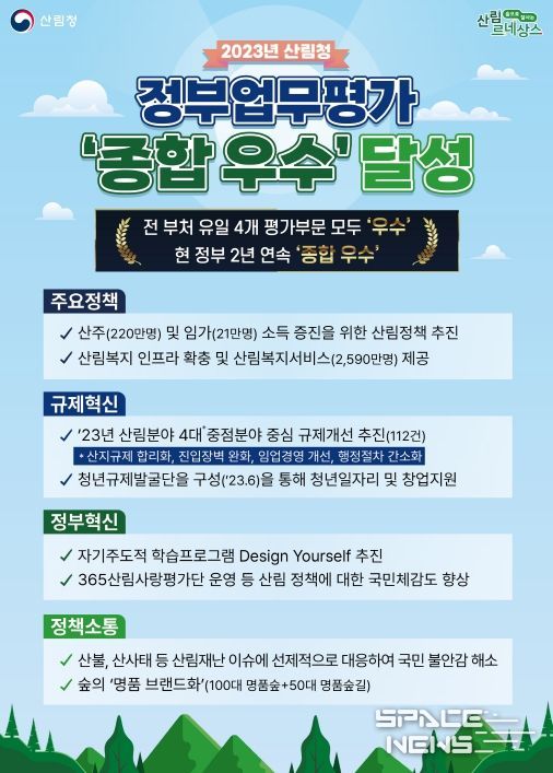 스페이스뉴스 스페이스뉴스 기자 | 산림청은 45개 중앙행정기관 대상 2023년 정부업무평가에서 기관 종합평가 ‘우수’에 선정되는 영예를 차지했다고 밝혔다.