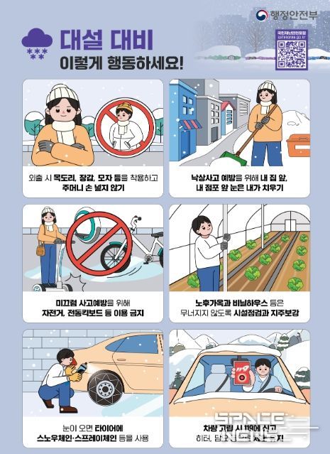 이상민 중앙재난안전대책본부장은 “정부는 지자체 등 관계기관과 함께 비닐하우스, 축사, 노후 건축물 등 적설취약시설에 대한 안전점검을 강화하고, 재난문자·재난방송 등을 활용하여 기상특보 및 겨울철 행동요령을 지속 안내하겠다”라고 강조하면서, “국민께서도 차량 감속운행과 ‘내 집, 내 점포 앞 눈 치우기’ 등 대설 피해 예방에 적극 동참해 주실 것”을 당부했다.