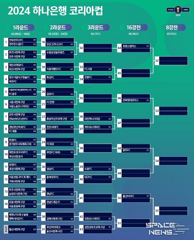 스페이스뉴스 스페이스뉴스 기자 | 아마추어와 프로를 망라해 최고의 구단을 가리는 코리아컵의 1~4라운드 대진이 확정됐다.