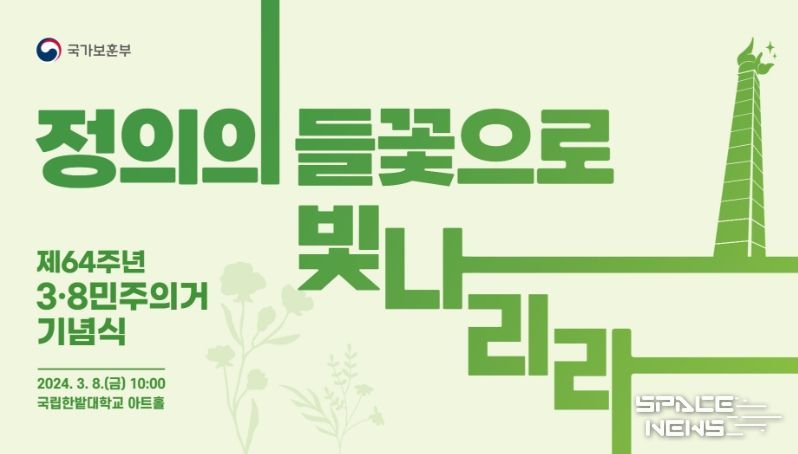 스페이스뉴스 스페이스뉴스 기자 | 국가보훈부는 1960년 대전지역 학생들이 중심이 되어 일어난 충청권 최초의 민주화 운동인 3·8민주의거를 기억하고 그 정신을 계승하기 위한 ‘제64주년 3·8민주의거 기념식’을 8일 오전 10시 국립한밭대학교(아트홀, 대전광역시 유성구)에서 거행한다고 밝혔다.