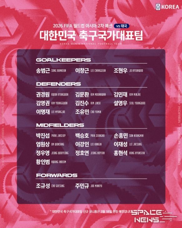 스페이스뉴스 스페이스뉴스 기자 | 대한축구협회(KFA)는 3월 열리는 2026 FIFA 북중미 월드컵 2차 예선 태국과의 2연전에 나설 남자 축구 국가대표팀 23명의 명단을 11일 발표했다.