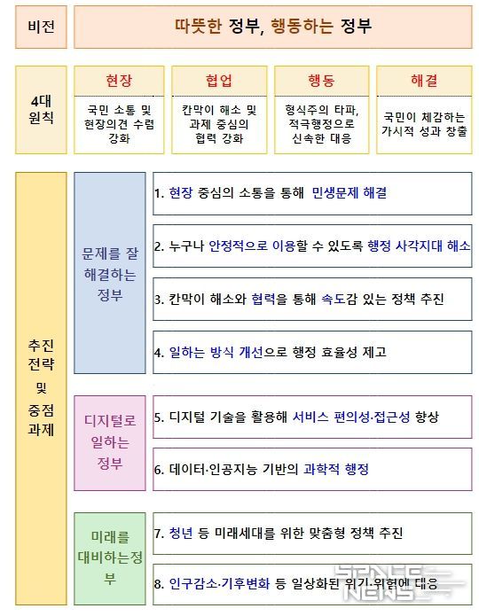 ‘2024년 정부혁신 종합계획’은 최근 민생토론회 등에서 윤석열 대통령이 강조한 정부혁신 방향을 담아 ‘따뜻한 정부, 행동하는 정부’라는 비전과 4대 원칙(현장, 협업, 행동, 해결)을 설정하고 3대 전략, 8개 중점과제에 따라 총 110개의 세부과제를 담았다.
