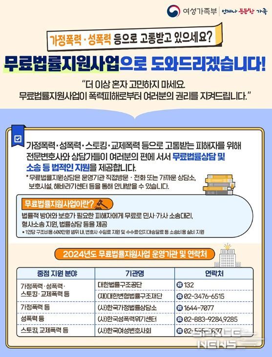 법률적 방어와 보호가 필요한 피해자에게 무료로 민사·가사 소송대리, 형사소송 지원, 법률상담 등을 제공