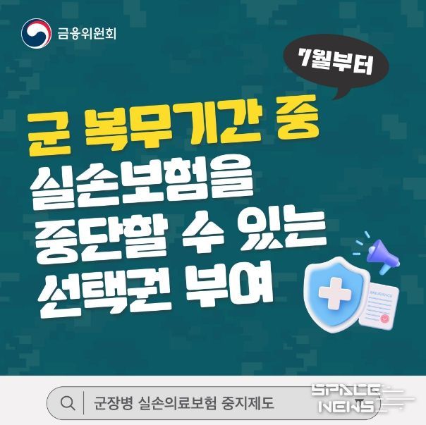 스페이스뉴스 스페이스뉴스 기자 | 7월부터 ‘군장병 실손의료보험 중지제도’로 군 복무기간 중 실손보험을 중단할 수 있는 선택권을 부여합니다.