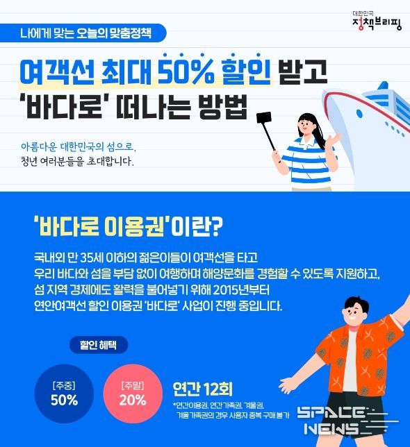 국내외 만 35세 이하의 젊은이들이 여객선을 타고 우리 바다와 섬을 부담 없이 여행하며 해양문화를 경험할 수 있도록 지원하고, 섬 지역 경제에도 활력을 불어넣기 위해 2015년부터 연안여객선 할인 이용권 ‘바다로’ 사업이 진행 중입니다.