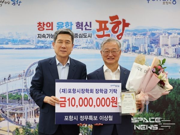 스페이스뉴스 스페이스뉴스 기자 | 이상철 포항시 정무특보가 퇴임을 앞두고 22일 인재 육성 장학금 1,000만 원을 포항시 장학회에 기탁하며 지역사회에 훈훈한 미담이 되고 있다.