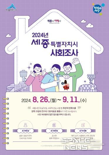 스페이스뉴스 스페이스뉴스 기자 | 세종특별자치시가 26일부터 오는 9월 11일까지 표본 1,800가구를 대상으로 사회조사를 실시한다.