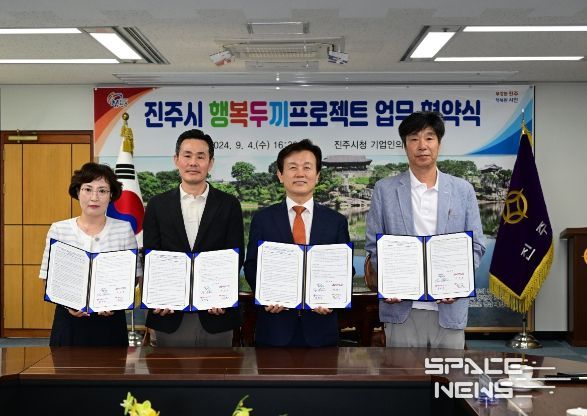 스페이스뉴스 스페이스뉴스 기자 | 진주시와 행복얼라이언스 사무국 행복나래(주), 행복도시락사회적협동조합, 아이쿱자연드림은 4일 기업인의 방에서 ‘행복 두끼 프로젝트’ 추진을 위한 업무협약을 체결했다.