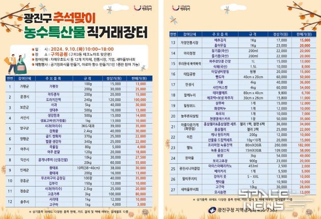 스페이스뉴스 스페이스뉴스 기자 | 광진구가 오는 10일 구의공원에서 ‘추석맞이 농수특산물 직거래장터’를 개최한다.