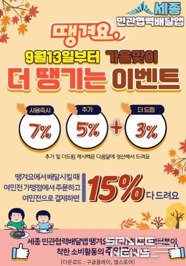 이번 소비자 혜택 확대는 추석 명절과 세종축제 기간 침체된 지역 내 소비를 유도하고 세종 민관협력 배달앱 땡겨요를 활성화하기 위해 추진된다.