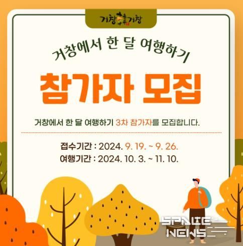 스페이스뉴스 스페이스뉴스 기자 | 거창군은 오는 10월 3일부터 11월 10일까지 운영하는 ‘거창에서 한 달 여행하기’에 참여할 15팀을 9월 26일까지 모집한다고 밝혔다.