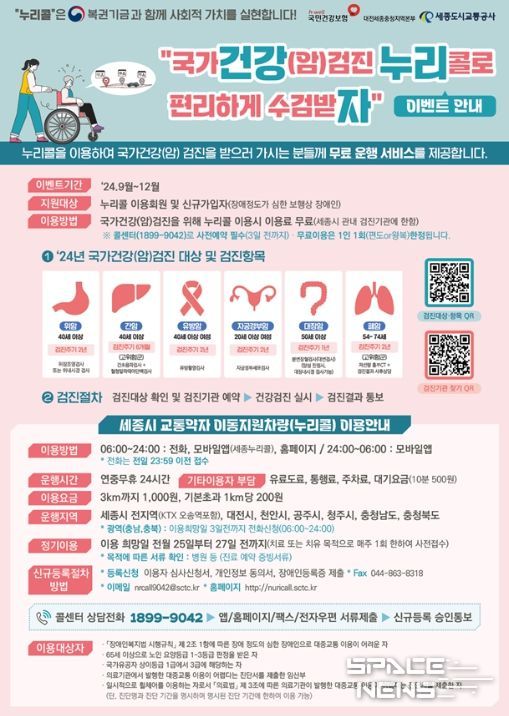 스페이스뉴스 스페이스뉴스 기자 | 세종도시교통공사는 관내 교통약자의 건강한 삶을 보장하고자 국민건강보험공단 대전세종충청지역본부(본부장 이정수)와 함께 국가건강검진을 받는 누리콜 이용자를 대상으로 무료운행 지원 이벤트를 진행한다고 밝혔다.