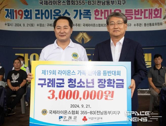 스페이스뉴스 스페이스뉴스 기자 | 전남 구례군은 국제라이온스협회 355-B3(전남동부)지구가 지난 21일 화엄사 일원에서 열린 제19회 라이온스 가족 한마음 등반대회에서 구례군 청소년들을 위한 장학금 300만 원을 기탁했다고 밝혔다.
