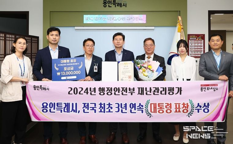 스페이스뉴스 스페이스뉴스 기자 | 용인특례시는 11일 행정안전부에서 주관하는 '2024 재난관리평가 우수기관 시상식‘에서 대통령 표창을 수상하고 특별교부세 2억 4500만원을 지원 받았다고 13일 밝혔다.