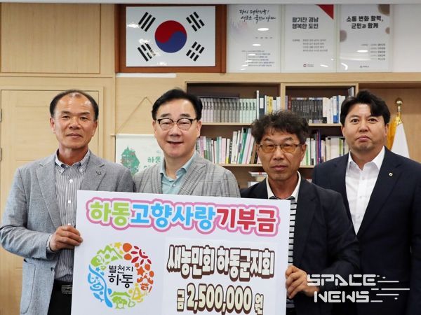 스페이스뉴스 스페이스뉴스 기자 | 새농민회 하동군지회 회원 자제들과 김해장유농협 임직원이 17일, 하동군에 고향사랑기부금을 전달했다.