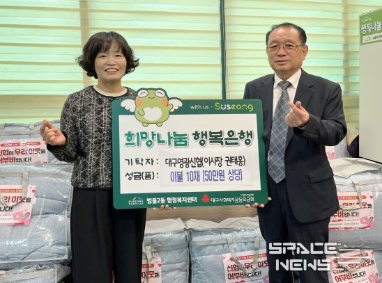 스페이스뉴스 스페이스뉴스 기자 | 대구영광신협은 지난 17일 수성구 범물2동 행정복지센터를 찾아 지역의 어려운 이웃을 위해 써달라며 이불 10채(50만원상당)를 전달했다.