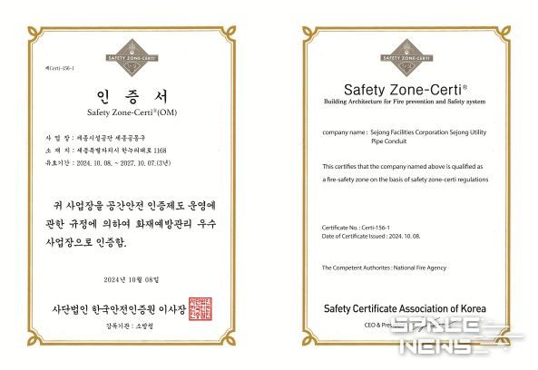 스페이스뉴스 스페이스뉴스 기자 | 세종특별자치시시설관리공단의 공동구 사업장이 ‘공간안전인증’(Safety-Zone Certification)을 2021년 공동구 중 최초로 획득한데 이어, 연속 획득했다고 밝혔다.