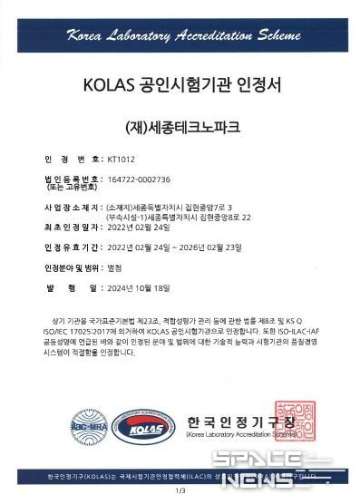 스페이스뉴스 스페이스뉴스 기자 | 세종시 미래가치를 선도하는 지역혁신성장 거점기관 (재)세종테크노파크는 10월 18일 한국인정기구로부터 KOLAS 공인인증시험기관의 인정범위 확대 승인을 받았다고 밝혔다.