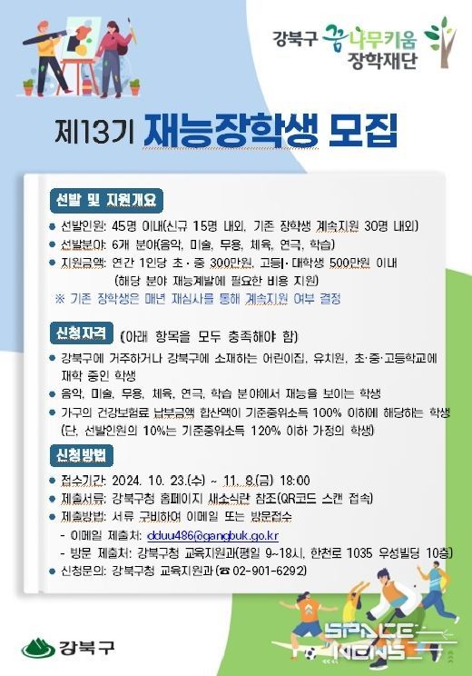 스페이스뉴스 스페이스뉴스 기자 | 서울 강북구와 강북구 꿈나무키움 장학재단(이사장 최기석)은 오는 11월 8일까지 강북구 꿈나무키움 장학재단 제13기 재능장학생을 모집한다고 밝혔다.
