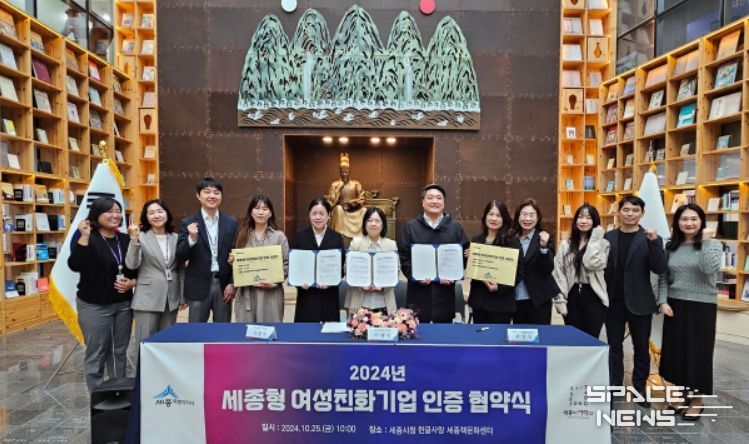 스페이스뉴스 스페이스뉴스 기자 | 세종특별자치시가 25일 세종시청 한글사랑 책문화센터에서 ‘2024년 세종형 여성친화기업’ 인증 협약식을 개최했다.