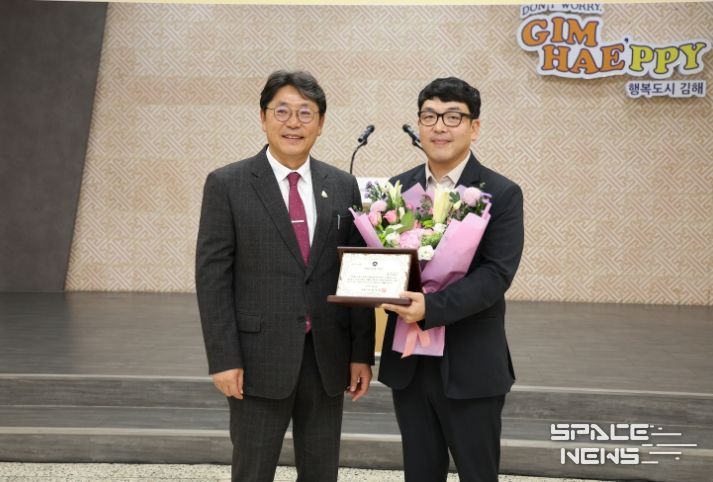 스페이스뉴스 스페이스뉴스 기자 | 김해시는 4일 오전 김해시청 대회의실에서 주촌면 소재 ㈜동산전자 한슬기 대표에게 ‘11월 자랑스러운 김해 CEO상’을 수여했다.