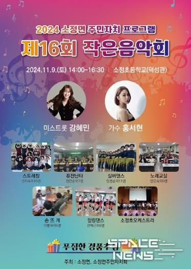 스페이스뉴스 스페이스뉴스 기자 | 세종특별자치시 소정면 주민자치회가 오는 9일 ‘제16회 소정면 작은음악회’를 소정초등학교 덕성관에서 개최한다.