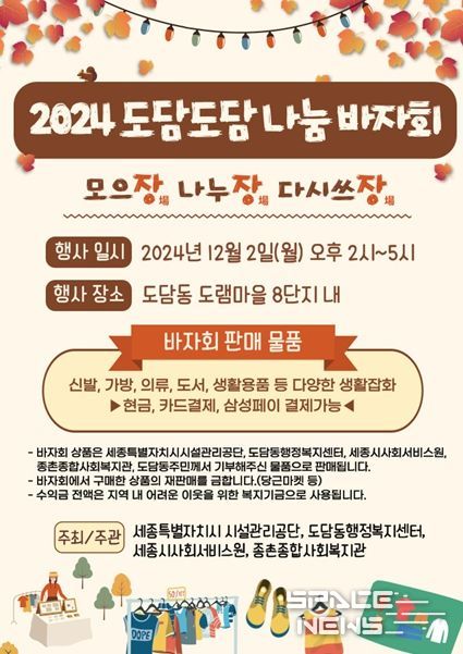 이번 바자회는 12월 2일 오후 2시부터 5시까지 공단이 운영하는 도담동 도램마을 8단지에서 열리며, 세종시 민·관 4개 기관 임직원들과 지역 주민이 기증한 다양한 생활용품, NH농협 세종시청점에서 후원한 물품 등을 저렴한 가격으로 판매할 예정이다.