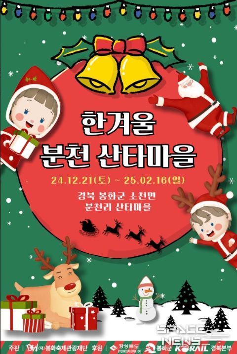 스페이스뉴스 스페이스뉴스 기자 | (재)봉화축제관광재단이 주최·주관하고 경상북도, 봉화군, 코레일 경북본부가 후원하는 봉화의 대표 겨울 축제 ‘2024-2025 한겨울 분천산타마을’이 오는 12월 21일부터 2025년 2월 16일까지 58일간 봉화군 소천면 분천산타마을 일원에서 운영된다.