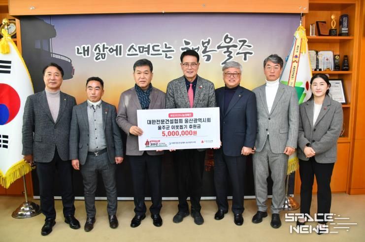 스페이스뉴스 스페이스뉴스 기자 | 대한전문건설협회 울산광역시회가 16일 군청 소회의실에서 이순걸 군수, 조현철 회장 등 관계자들이 참석한 가운데 울주군에 성금 500만원을 전달했다.