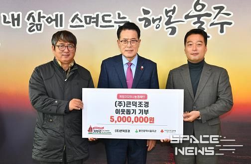 스페이스뉴스 스페이스뉴스 기자 | ㈜큰덕조경이 19일 울주군청 소회의실에서 이순걸 군수, 김지만 대표이사, 울산사회복지공동모금회 차정하 팀장 등 관계자들이 참석한 가운데 성금 500만원을 전달했다.