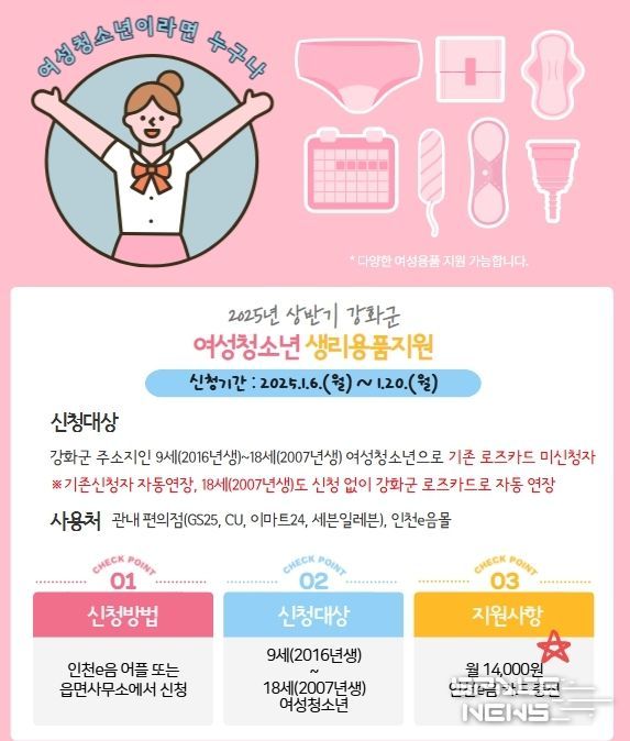 스페이스뉴스 스페이스뉴스 기자 | 강화군이 오는 20일까지 상반기 여성청소년 보건위생물품 지원 신청을 받는다.