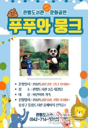 공연 일정과 내용을 살펴보면, ▲2월 22일 영유아의 눈높이에 맞춘 인형극 ‘푸푸와 뭉크’(관평도서관) ▲3월 22일 신나는 음악에 맞춰 드로잉 매직 퍼포먼스를 보여주는 ‘드로잉 매직쇼 크레용용’(원신흥도서관) ▲4월 26일 어린이 자존감 향상 인형극 ‘달라도 괜찮아’(전민도서관)가 무대에 오른다.