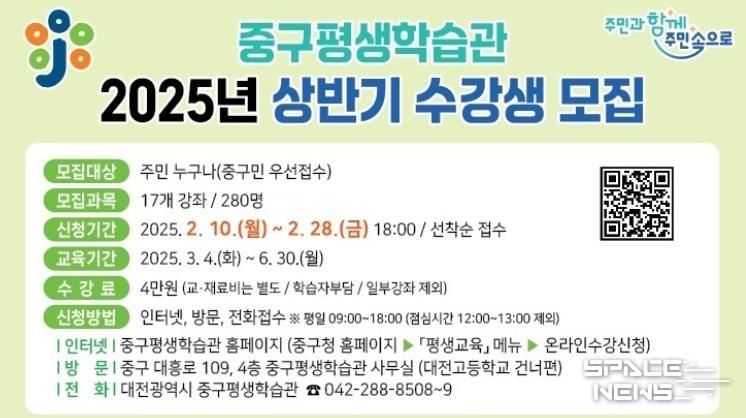 스페이스뉴스 스페이스뉴스 기자 | 대전 중구는 이달 말까지 2025년 상반기 중구평생학습관 프로그램 수강생을 선착순 모집한다고 10일 밝혔다.