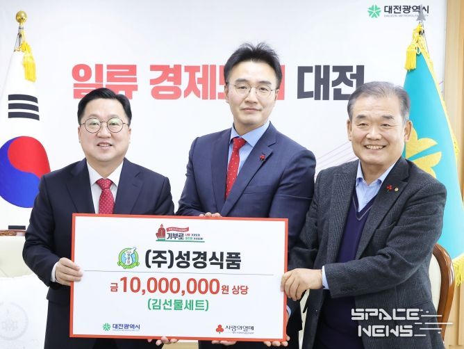 스페이스뉴스 스페이스뉴스 기자 | 11일 대전지역 대표하조미김 생산 전문 기업 ㈜성경식품(대표이사 육현진)에서 김세트 1,000만원 상당을 대전시(시장 이장우)에 기탁했다.