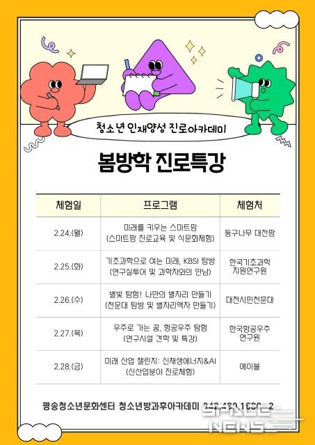 스페이스뉴스 스페이스뉴스 기자 | 대전시는 평송청소년문화센터 주관으로 청소년 인재 양성 진로 아카데미‘봄방학 진로 특강’프로그램을 오는 24일부터 28일까지 운영한다.