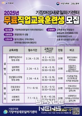 스페이스뉴스 스페이스뉴스 기자 | 기장군은 오는 24일부터 군 직영 ‘기장여성새로일하기센터’에서 ‘2025년 직업교육훈련’ 교육생 모집 일정에 들어간다고 19일 밝혔다.