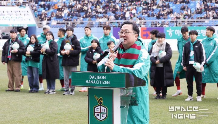 스페이스뉴스 스페이스뉴스 기자 | 이장우 대전시장이 23일 2025 K리그1 대전하나시티즌 홈 개막전(상대팀 : 울산 HD FC)에 참석했다. 이장우 시장은 “홈 개막전에 맞춰 꿈돌이 굿즈 상품이 출시됐다”라면서 “시민 여러분의 많은 관심 부탁드린다”라고 당부했다. 그러면서 이번 시즌이 하나시티즌이 일류 축구 도시 대전의 새 역사를 쓰는 한 해가 되기를 응원한다”라고 말했다.